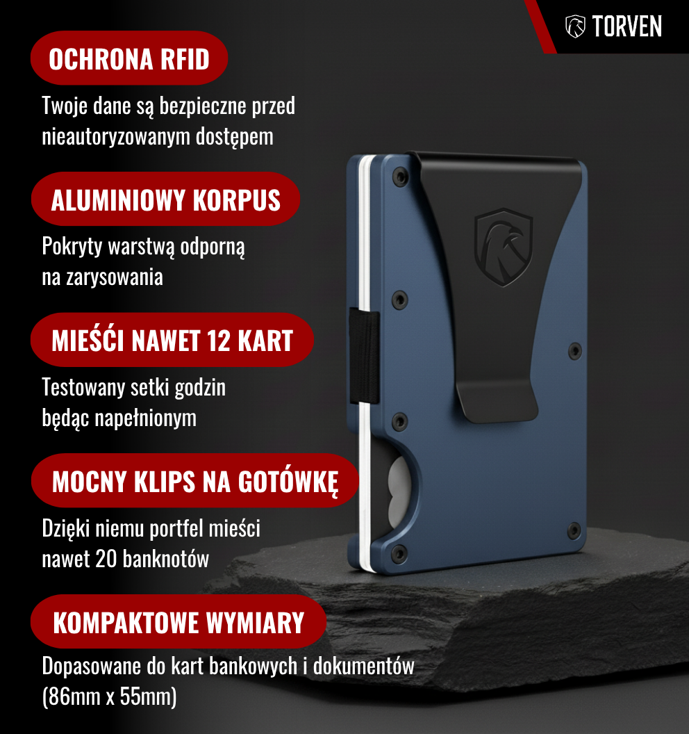 Poza samym portfelem otrzymujesz w zestawie śrubokręt potrzebny przy wymianie lub demontażu klipsu/paska, pasek, zapasowe śrubki, smycz TORVEN z mocnym karabińczykiem, a wszystko to zapakowane w ozdobne pudełko sygnowane naszym logo.