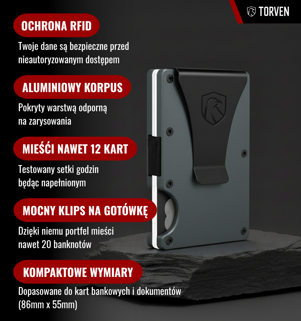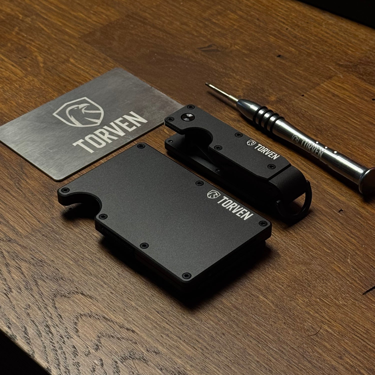 Poza samym portfelem otrzymujesz w zestawie śrubokręt potrzebny przy wymianie lub demontażu klipsu/paska, pasek, zapasowe śrubki, smycz TORVEN z mocnym karabińczykiem, a wszystko to zapakowane w ozdobne pudełko sygnowane naszym logo.