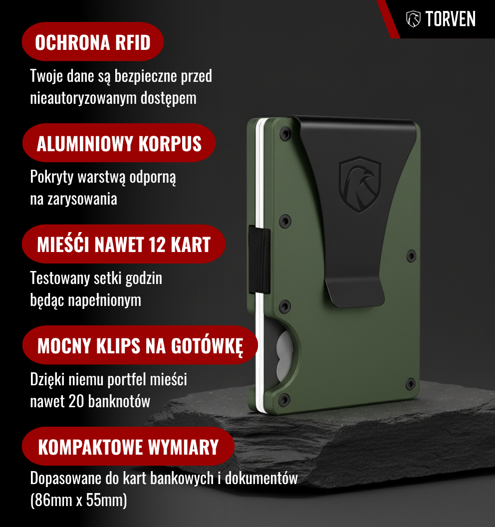 Poza samym portfelem otrzymujesz w zestawie śrubokręt potrzebny przy wymianie lub demontażu klipsu/paska, pasek, zapasowe śrubki, smycz TORVEN z mocnym karabińczykiem, a wszystko to zapakowane w ozdobne pudełko sygnowane naszym logo.